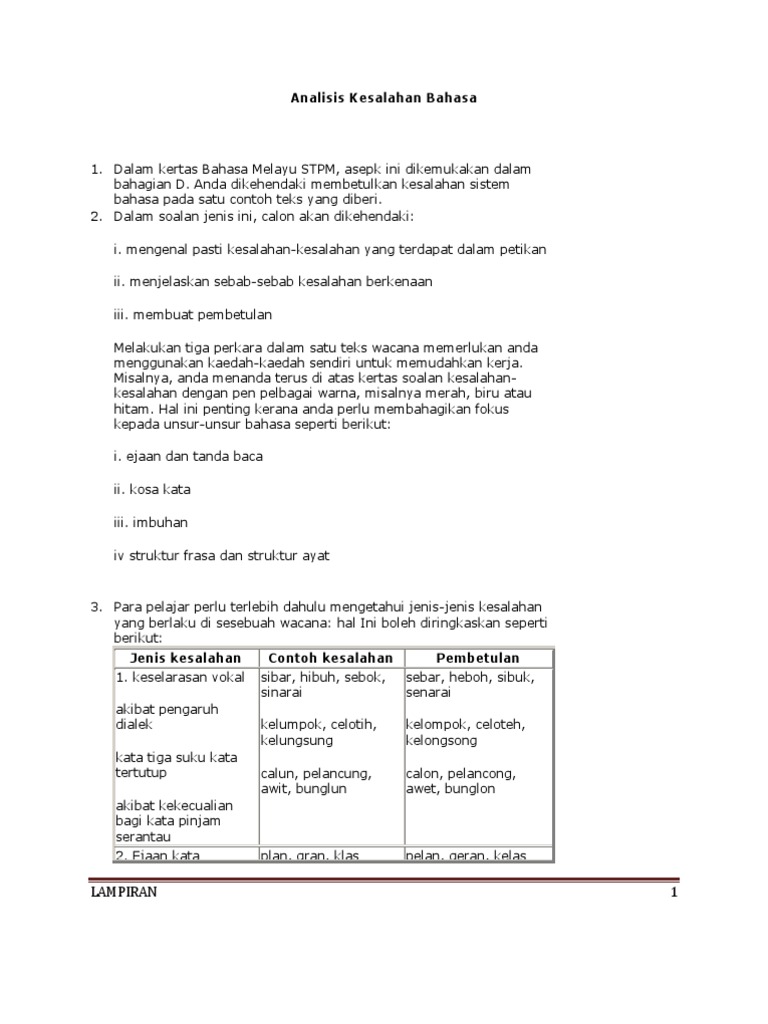 Kesalahan-kesalahan penggu naan dalam bahasa Melayu hari i ni baik dalam tulisan mahupun percakapan terdapat di dalam berbagai segi. Bahasa kebangsaan negara Bahasa rasmi negara kita Bahasa pengantar dalam sistem pendidikan Bahasa ibunda bahasa pertama Bahasa perpaduan kaum. PENYUNTINGAN Contoh 1 Dalam petikan 1 terdapat enam kesalahan bahasa manakala petikan 2 terdapat lima kesalahan bahasa.